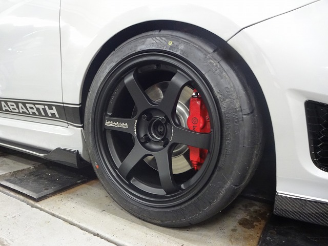 サーキット仕様でカスタムされている、Tさんのアバルト595コンペティツィオーネ。マッキナ専売TE37 16インチのマットブラックを装着し、スパルタンに決まってます!また各部のレーシーなカスタムも魅力です。