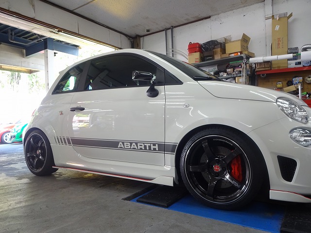 福井県からご来店いただいた、Oさんのアバルト595コンペティツィオーネ。足元はADVAN+KWを軸に剛性パーツやカーボン水圧転写まで手が入り、マッキナエアロパーツでフルカスタムさせていただきました。