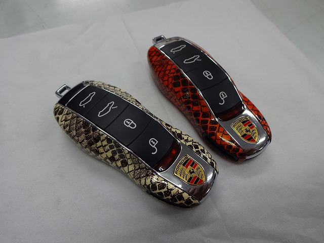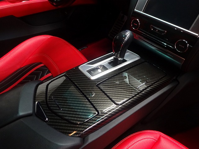 左はカーボンtype2スモーク施工のベンツグリル。右はカーボンtype2スモーク+赤塗装仕上げのレンジローバーエンジンヘッドカバー。右はカーボンtype2施工したポルシェのセンターコンソール。