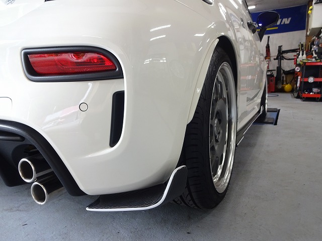 特徴的な造形のフロントリップスポイラーは、約5p出した中央部は先端を跳ね上げた形状にし、尚且つ角を逆エッジラインにする事で店などへの出入りに考慮し走りやすく工夫。サイドはスポーティーに立ち上げた形状で、躍動感あるスタイルを演出します。